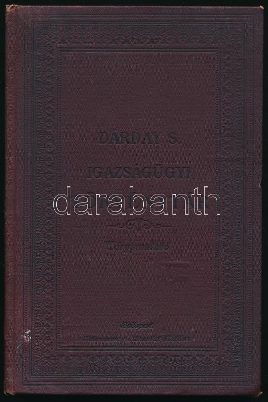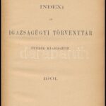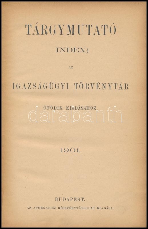 Tárgymutató. Index az Igazságügyi törvénytár ötödik kiadásához. 1901., Bp., 1901., Athenaeum. Kiadói kopott egészvászon-kötésben.