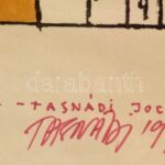 Tasnádi József (1960-): Joseph Roulette, 1999. Nyomat, papír. Jelezve jobbra lent. Autográf ajándékozási sorokkal. Üvegezett, kissé sérült fakeretben. 50×82 cm<a href="https://www.darabanth.com/hu/gyorsarveres/436/kategoriak~Festmenyek-es-grafikak/F