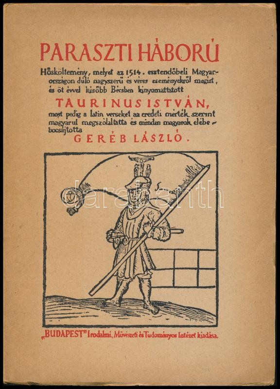 Taurinus István: Paraszti háború. Hősköltemény Dózsa György harcáról, tetteiről, haláláról. Írta 1514-1519-ben: – -. gyulafehérvári vikárius. Latin eredetiből fordította Geréb László. Egykorú fametszetekkel.
