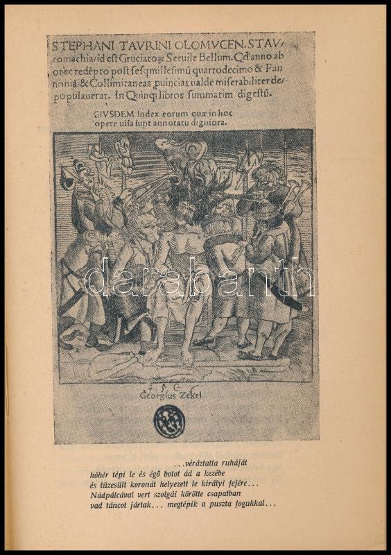 Taurinus István: Paraszti háború. Hősköltemény Dózsa György harcáról, tetteiről, haláláról. Írta 1514-1519-ben: – -. gyulafehérvári vikárius. Latin eredetiből fordította Geréb László. Egykorú fametszetekkel. Bp.,[1946],Budapest Irodalmi, Művészeti és Tudo