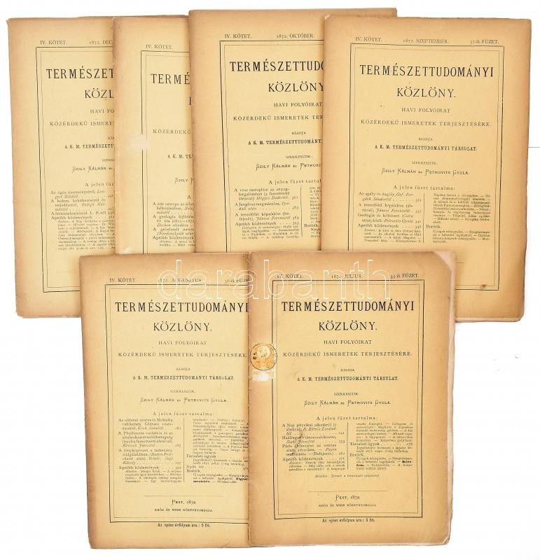 Természettudományi Közlöny 6 száma: IV. köt. 35-40. füzet, 1872. július-december. Pest, 1872, K. M. Természettudományi Társulat (Khór és Wein-ny.). Kiadói papírkötés, helyenként kissé sérült lapszélekkel, részben felvágatlan lapokkal.<a href="https: