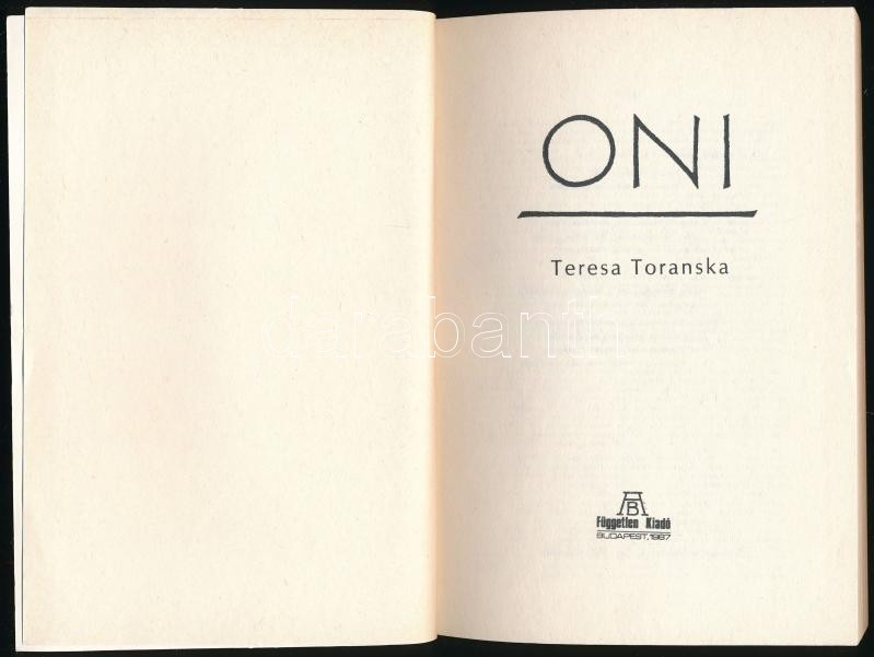 Toranska, Teresa: ONI. Sztálin lengyel bábjai. Bp., 1987, AB Független Kiadó. Szamizdat kiadás. Kiadói papírkötés.<a href="https://www.darabanth.com/hu/gyorsarveres/421/kategoriak~Konyvek/Konyvek-Tortenelem~1000008/Toranska-Teresa-ONI-Sztalin-lengye