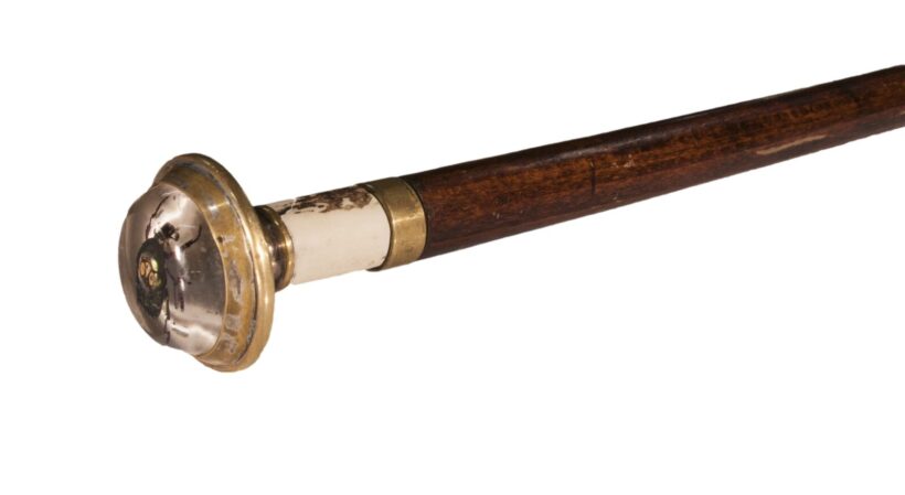 Fa, sárgaréz gyűrűvel, agancs toldással. Fogója fém keretezésű plexi ( benne bogárral ). XX. század I. fele. Hosszúság: 86 cm