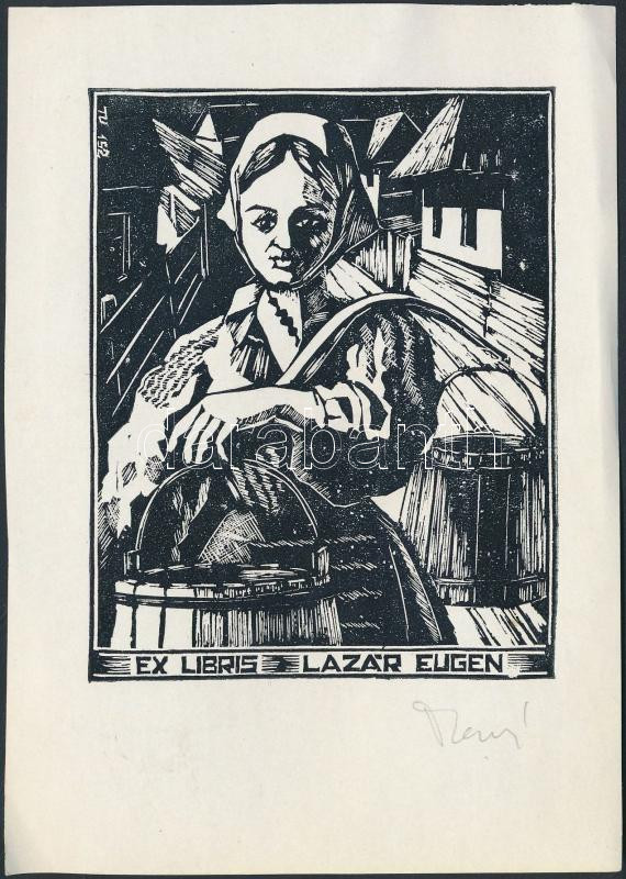 Torró Vilmos (1935-2001): Ex Libris, Lázár Eugen. Linómetszet, papír, jelzett, 9,5×8 cm<a href="https://www.darabanth.com/hu/gyorsarveres/417/kategoriak~Festmenyek-es-grafikak/Ex-libris-es-kisgrafika~3/Torro-Vilmos-1935-2001-Ex-Libris-Lazar-Eugen-Li