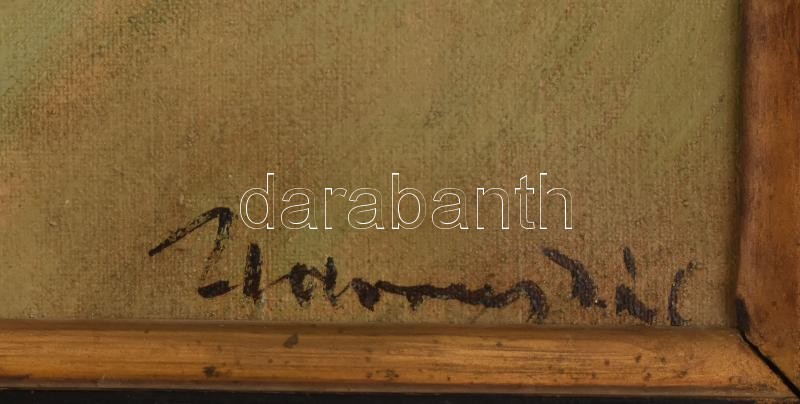 Udvary Pál (1900-1987): Lovasok a víz partján. Olaj, vászon. Jelezve jobbra lent. Dekoratív, sérült fakeretben. 80×60 cm<a href="https://www.darabanth.com/hu/nagyaukcio/38/kategoriak~Festmenyek-es-grafikak/Klasszikus-festmenyek-es-grafikak~15960/Udv