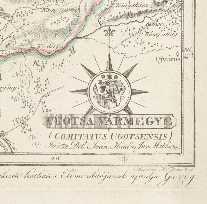 Ugotsa (Ugocsa) vármegye – Comitatus Ugotsensis térképe. Közreműködő: Görög-Votésky-Benedicti. Színezett rézmetszet, papír. Megjelent Görög Demeter ‘Magyar Atlasz azaz a’ magyar-, horvát- és tótországi megyék és szabad kerületek földképei’ című művében. L