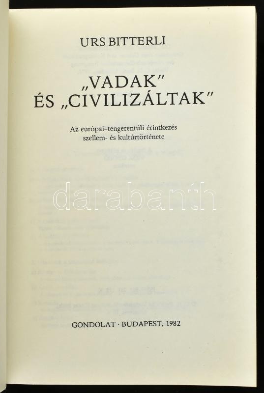 Urs Bitterli: ‘Vadak’ és ‘civilizáltak’. Az európai és tengerentúli érintkezés szellem- és kultúrtörténete. Bendl Júlia fordítása. Bp., 1982, Gondolat. Kiadói egészvászon kötésben, kiadói papír védőborítóban, jó állapotban.<a href="https://www.darab