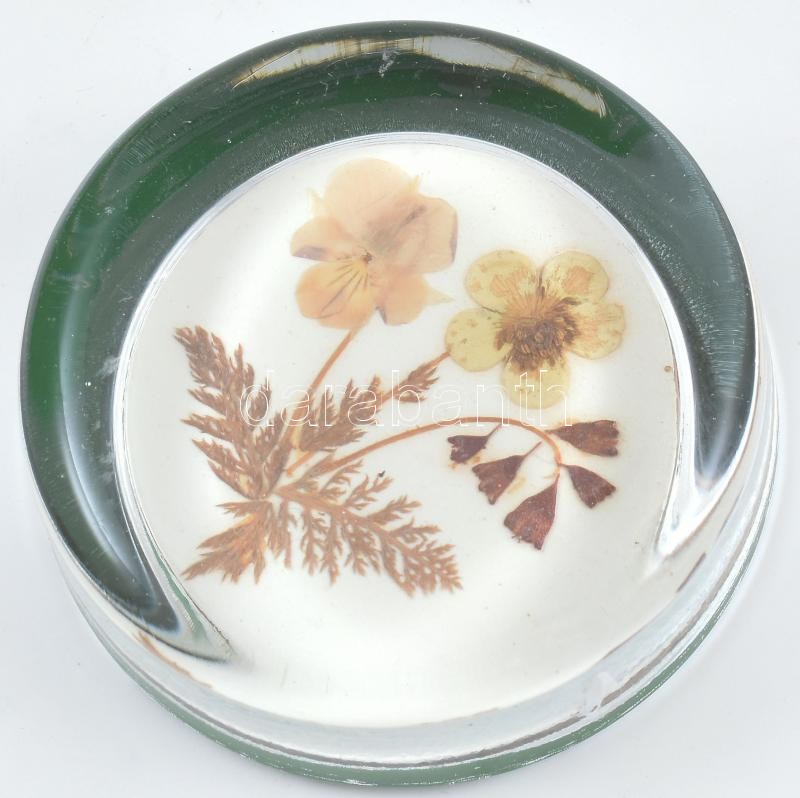 Üveg levélnehezék préselt virágokkal, kis kopásnyomokkal, d: 7 cm<a href="https://www.darabanth.com/hu/gyorsarveres/424/kategoriak~Porcelan-keramia-uveg/Uvegtargyak~500007/Uveg-levelnehezek-preselt-viragokkal-kis-kopasnyomokkal-d-7-cm~II2701092/?utm