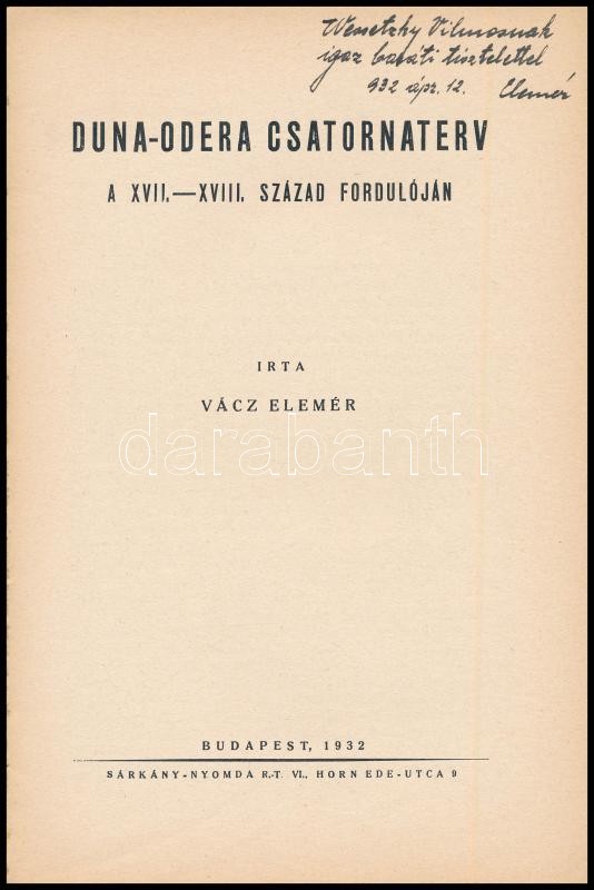 Vácz Elemér: Duna-Odera csatornaterv a XVII – XVIII. század fordulóján. A szerző, Vácz Elemér (1908-1996) által Wessetzky Vilmos (1909-1997. március 10.) történész, filológus, egyiptológus részére DEDIKÁLT példány. Bp., 1932.,