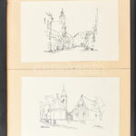 Vákár Tibor (1908 – ): Templomok. Tus, papír, jelezett, üvegezett keretben. 18×29,5cm