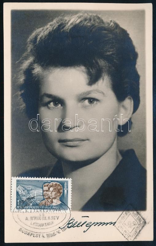 Valentyina Tyereskova (1937- ) szovjet űrhajós aláírása magát ábrázoló fotólapon / / Autograph signature of Valentina Tereshkova (1937- ) Soviet astronaut on photo postcard<a href="https://www.darabanth.com/hu/gyorsarveres/417/kategoriak~Mutargy-pap