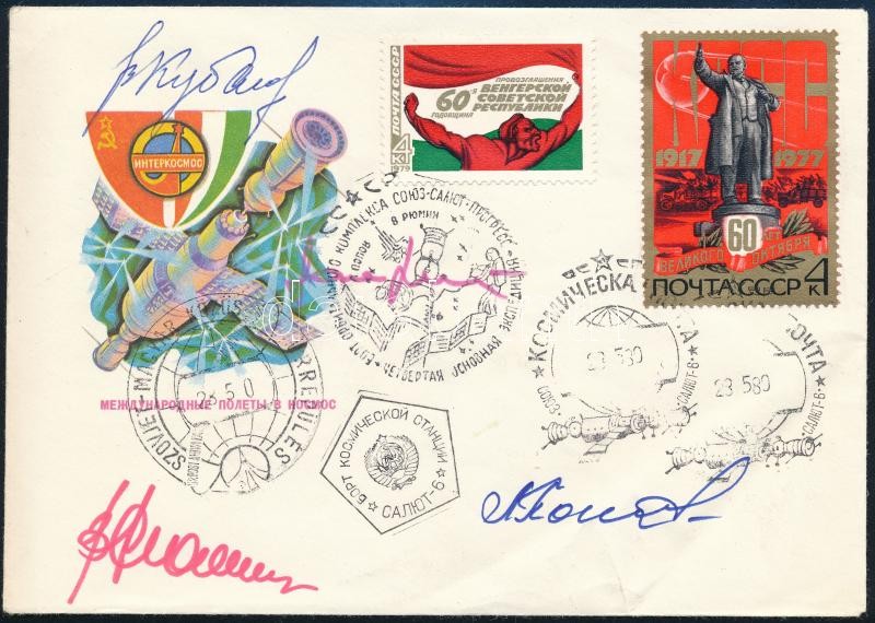 Valerij Kubaszov (1935-2014) és más űrhajósok aláírása borítékon + Szovjet-magyar közös űrrepülés emlékérem