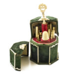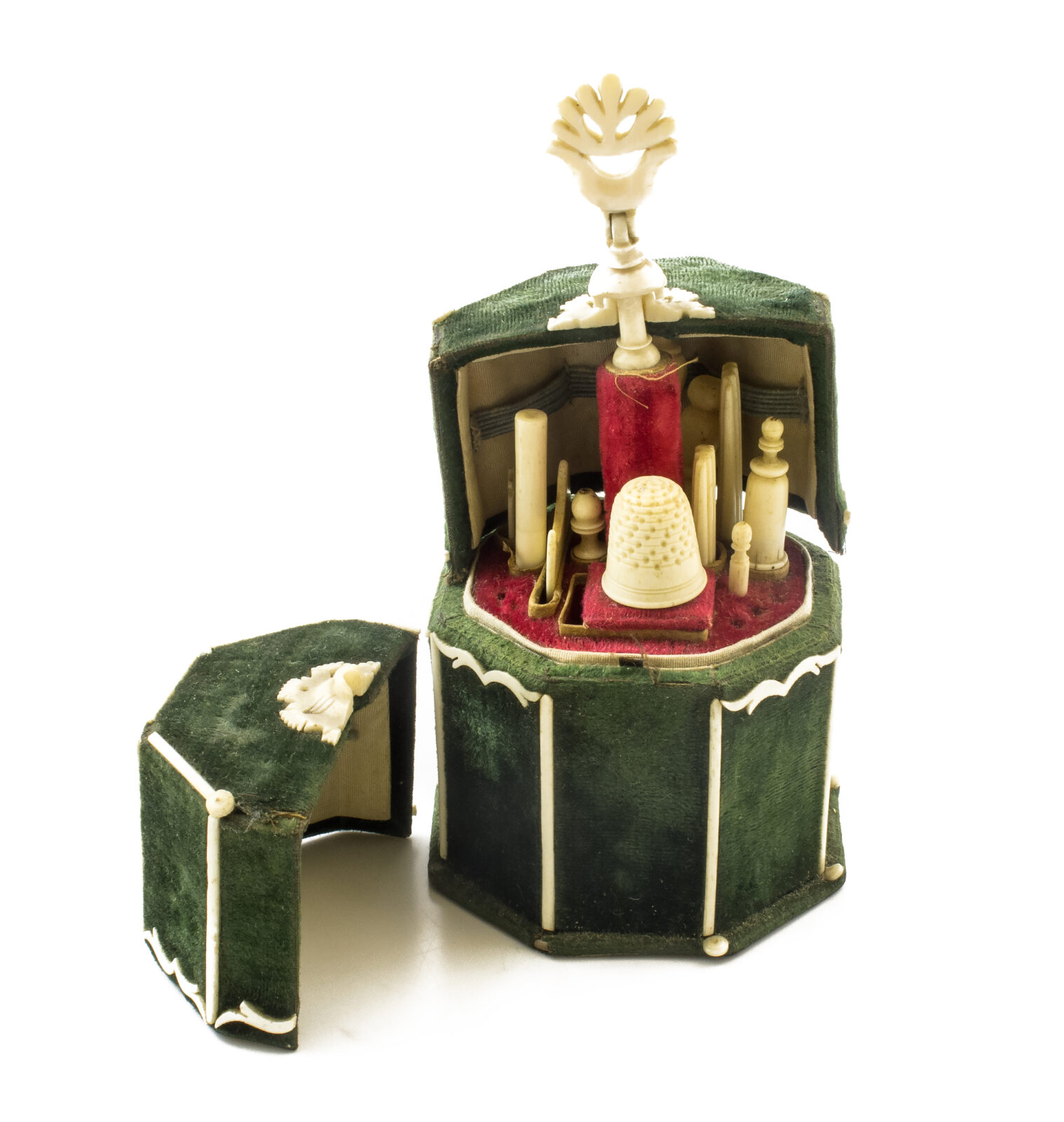 Bársony, csont. Nyolcszögletű hengeres forma, csontfilé applikációval. 11 darabos esztergált, faragott csont varróeszközökkel. A doboz fedele mobilis. XIX. század közepe. Magasság: 13 cm