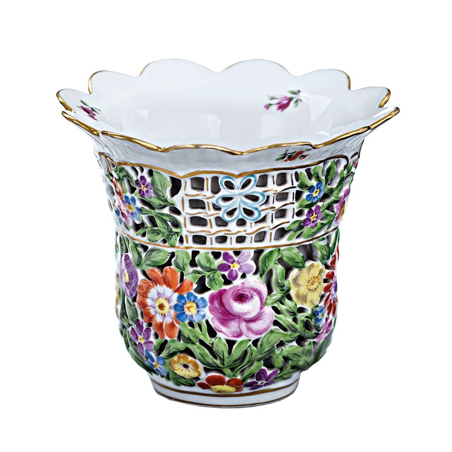 Herend, 20. sz. eleje, festett, aranyozott porcelán, áttört díszítéssel, jelezve az alján: máz alatti kék koronás jellel, m: 11, 5 cm