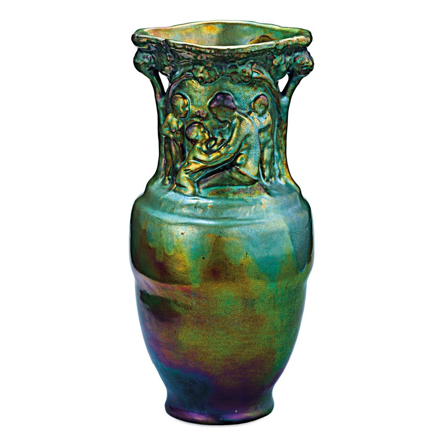Zsolnay gyár, Pécs, 1910 körül, eozinmázas fehércserép nyakán plasztikus Anya gyermekével ábrázolással, jelezve az alján: domború körpecséttel, formaszám: 813, kis sérüléssel, m: 29 cm