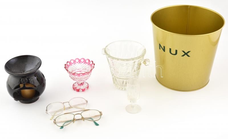 Vegyes bolha tétel: fém kaspó, üveg vödör, kerámia mécsestartó, 2 db szemüvegkeret