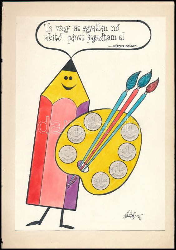 Vértes György (1930-1979): ‘Te vagy az egyetlen nő… (karikatúra). Tus, akvarell, kollázs, papír. Jelezve jobbra lent. Papírra kasírozva 25,5×18 cm<a href="https://www.darabanth.com/hu/gyorsarveres/431/kategoriak~Festmenyek-es-grafikak/Festmenyek-e