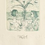 Vetlényi Zsolt (1967-): Beszélgetés az Üveg-tenger-parton. Színes rézkarc, merített papír, jelzett, számozott: 72/100, 7,5×7,5 cm