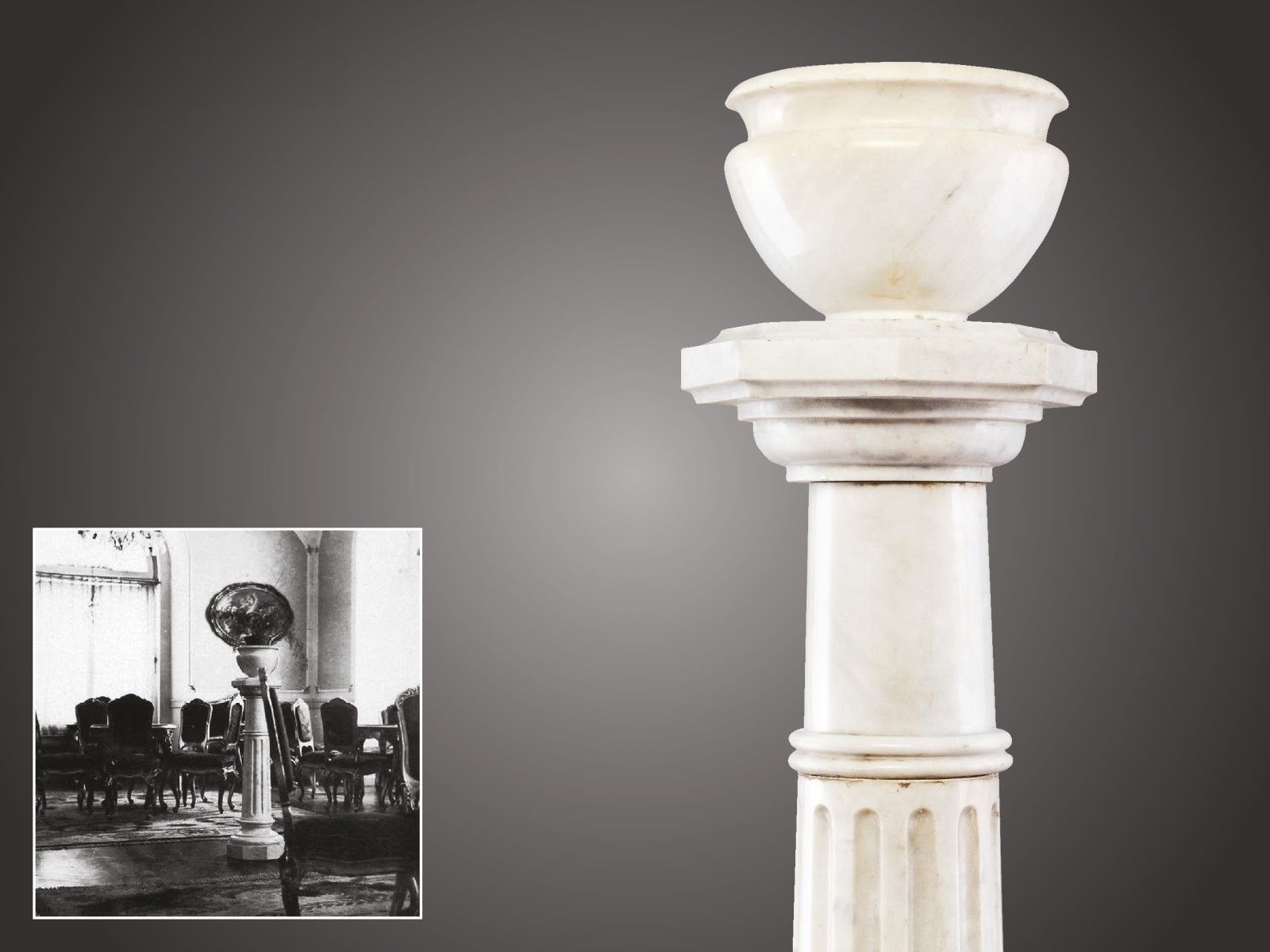 Faragott márvány. Szögletes talpon tagolt, kanellúrázott posztamens öblös kaspóval.