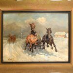 Viski János (1891-1987): Téli vágta. Olaj, vászon, jelzett. Bal felén apró felületi sérüléssel. Fa keretben, 60×80 cm / oil on canvas, signed, with minor surface damage on the left side.