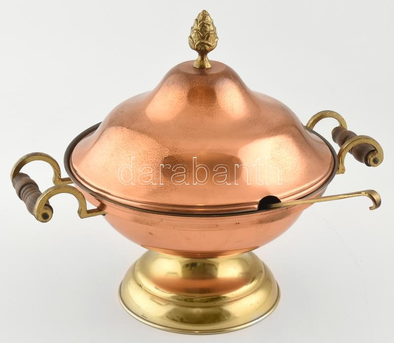 Vörösréz fedeles tál, merőkanállal, d: 26 cm, m: 31 cm