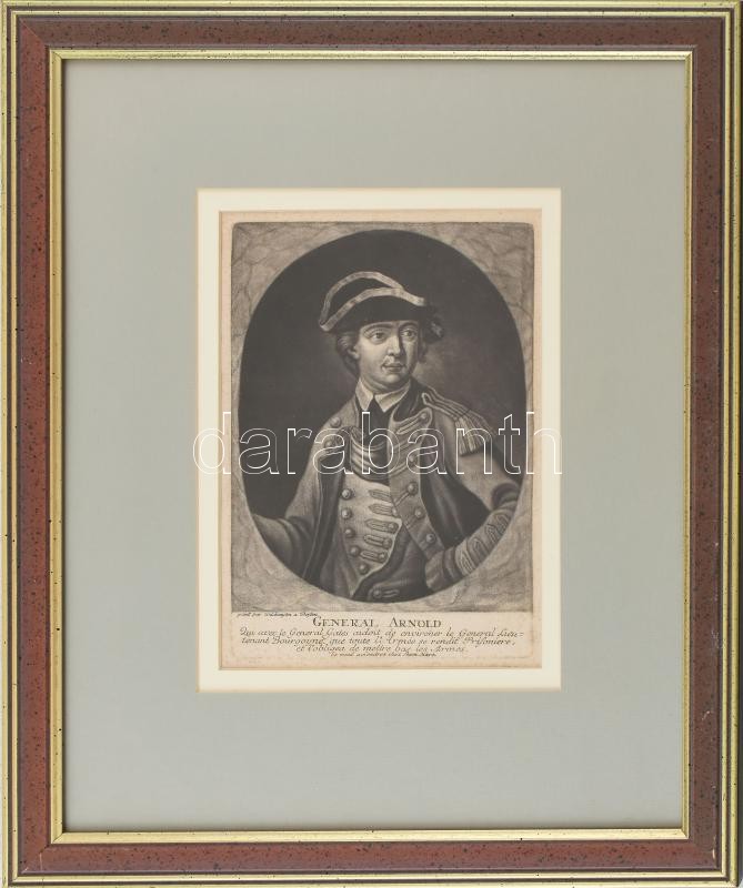 Wilckenson festménye után: Benedict Arnold (1740 k.-1801) amerikai tábornok portréja, 1776 körül. Mezzotinto, papír. Jelzett a metszeten. Thomas Hart, London kiadása. Kissé foltos. Üvegezett fakeretben. 22×15,5 cm<a href="https://www.darabanth.com/h