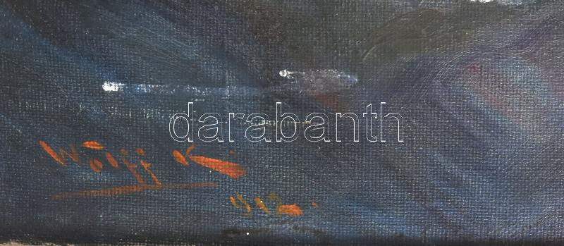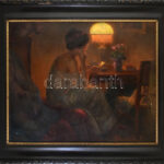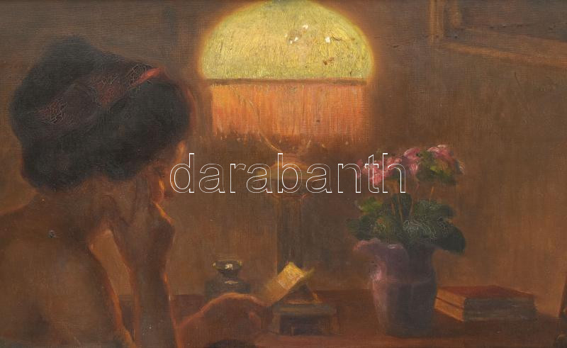 Wolff Károly (1869-1946): Olvasó hölgy lámpafénynél. Olaj, vászon. Jelzett. Apró sérülésekkel. Dekoratív, korabeli fakeretben. 75×100 cm / oil on canvas, signed, with small damages, framed. KIZÁRÓLAG SZEMÉLYES ÁTVÉTEL, NEM POSTÁZZUK! / ONLY PERSONAL COLLE