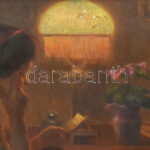 Wolff Károly (1869-1946): Olvasó hölgy lámpafénynél. Olaj, vászon. Jelzett. Apró sérülésekkel. Dekoratív, korabeli fakeretben. 75×100 cm / oil on canvas, signed, with small damages, framed. KIZÁRÓLAG SZEMÉLYES ÁTVÉTEL, NEM