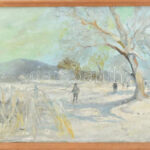 Wrabel (Vrábel) Sándor (1926-1992): Téli vadászok. Olaj, farost jelzett, fakeretben. 43×67 cm