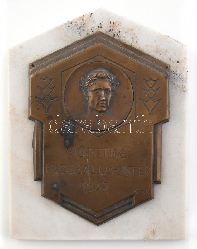 Württembergi labdarúgó bajnok bronz relief, alabástrom alapon, Németország 1932, jelzett: Kerr. 11,5x8cm<a href="https://www.darabanth.com/hu/gyorsarveres/411/kategoriak~Mutargy-papirregiseg-egyeb/Szobrok-kisplasztikak-plakettek~505010/Wurttembergi-