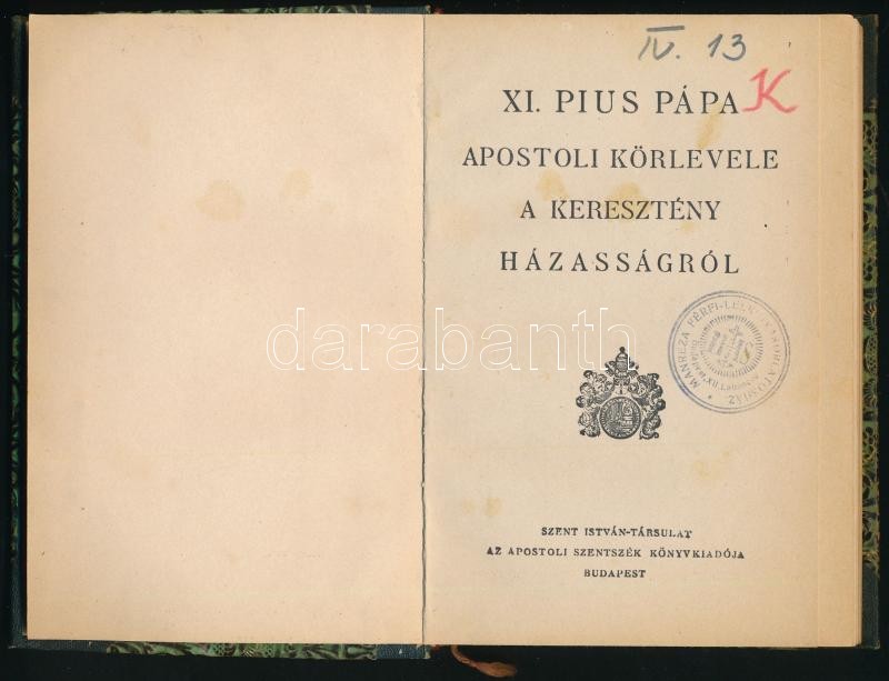 XI. Pius pápa apostoli körlevele a keresztény házasságról. Bp.,1931,Szent István-Társulat. Átkötött kopott félvászon-kötés, intézményi bélyegzővel.