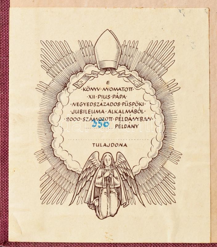 XII. Pius élete és válogatott beszédei. Írta és a beszédeket fordította: Zigány Miklós és Fényi András. Bp., 1943, Magyar Jövő. Második kiadás. Számozott (350./2000) példány. Kiadói, aranyozott, címeres egészvászon-kötésben, kopott borítóval, javított ger