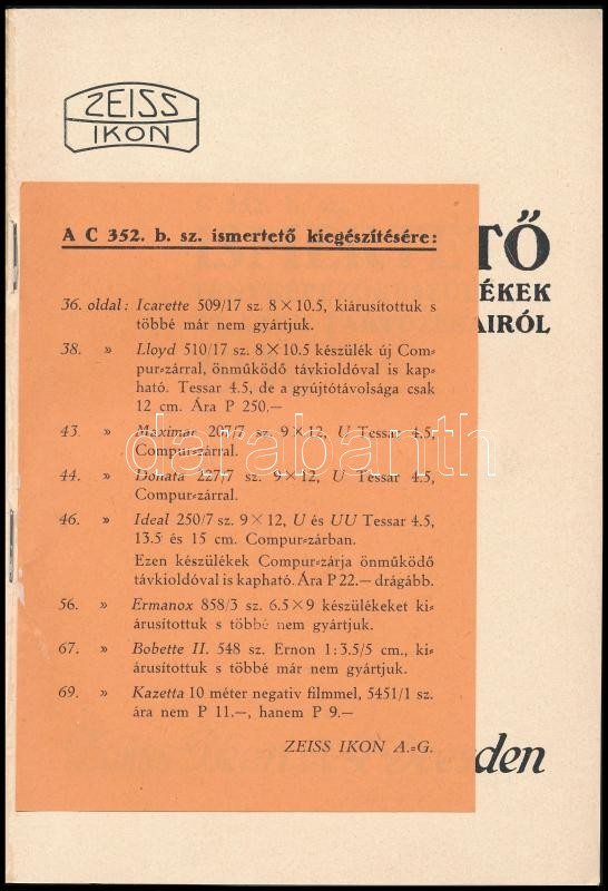 Zeiss Ikon C 352. b. sz. ismertető fényképezőkészülékek és azok tartozékairól. 1930. Dresden, 1930, Zeiss Ikon A.G., 80 p. Zeiss árukatalógus gazdag fekete-fehér képanyaggal, benne fényképezőgépekkel, kinematográfiai
