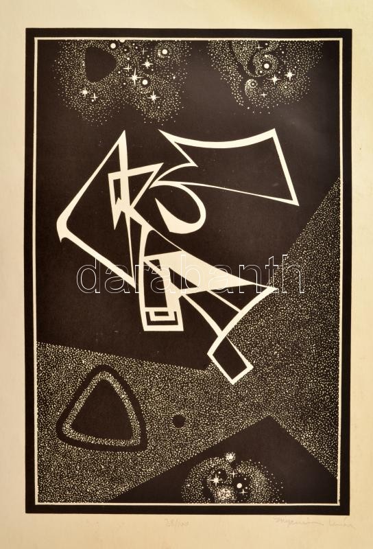 Zsigovics Iván (1958- ): Kozmosz (cím nélkül). Fametszet, papír, jelzett, számozott (38/100), a lap széle kissé foltos, 36×24 cm<a href="https://www.darabanth.com/hu/gyorsarveres/436/kategoriak~Festmenyek-es-grafikak/Festmenyek-es-grafikak~500001/Zs