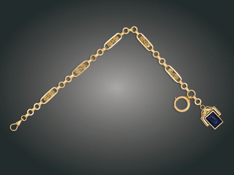 102. tétel, Óralánc, 14 k au, jáspis, ónix, 28,8 g