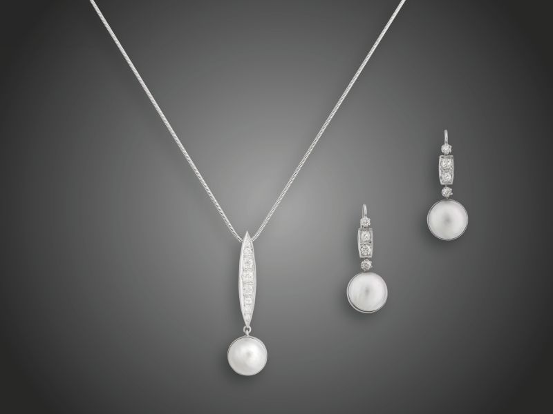 130. tétel, Ékszergarnitúra 3 db Fehérarany 585, kígyó fazonú láncon csüngős függő, mabe gyöngy és 8 különféle nagyságú és csiszolású briliáns ékítéssel, fülbevaló pár csüngős fazon, mabe gyöngy és 8 briliáns ékítéssel, patentzáras beakasztással, brilián