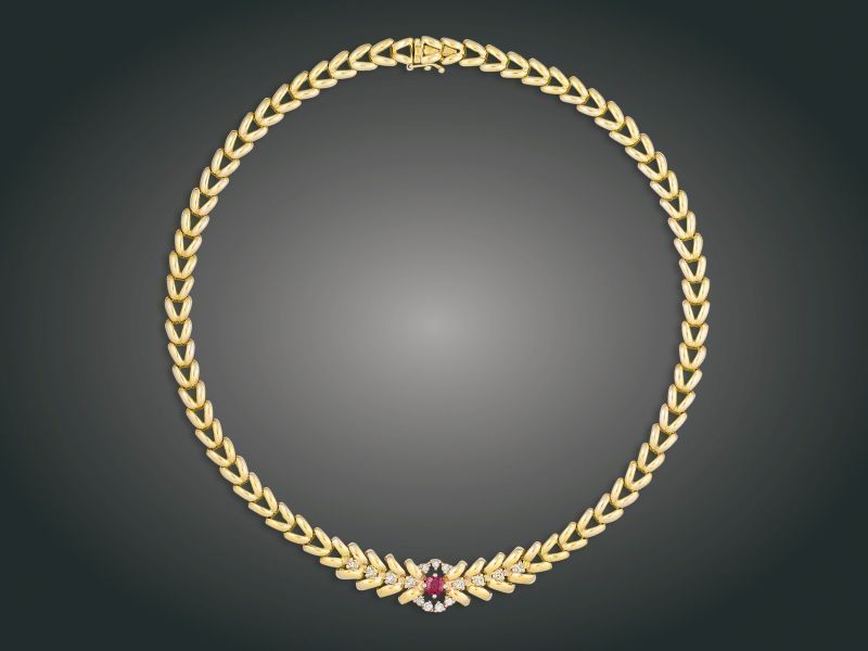 141. tétel, Nyakék, 14 k au, rubin, 15 bril. cca. 0,40 ct, 29,9 g