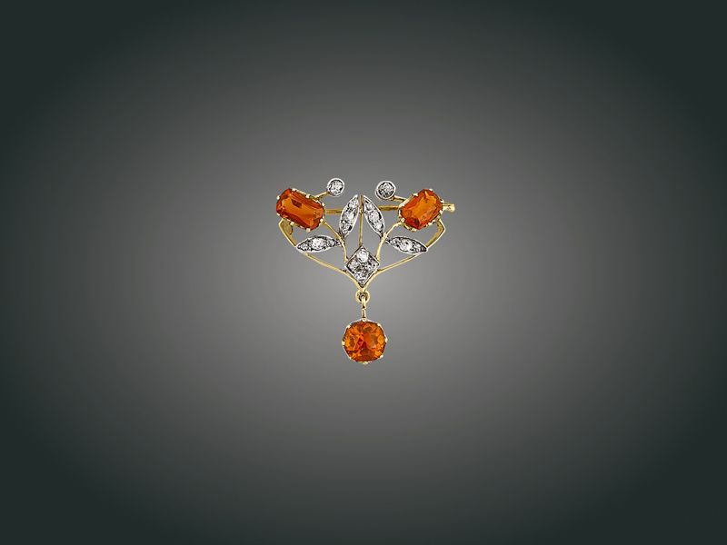 142. tétel, Melltű, 9 k au, 3 citrin, 18 gyém. cca. 0,80 ct, 6,7 g