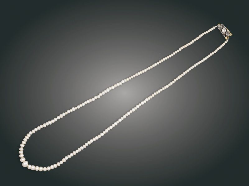 147. tétel, Gyöngysor, 14 k au, 1 bril. cca. 0,15 ct, 6 gyém., igazgyöngy, br. 6,1 g
