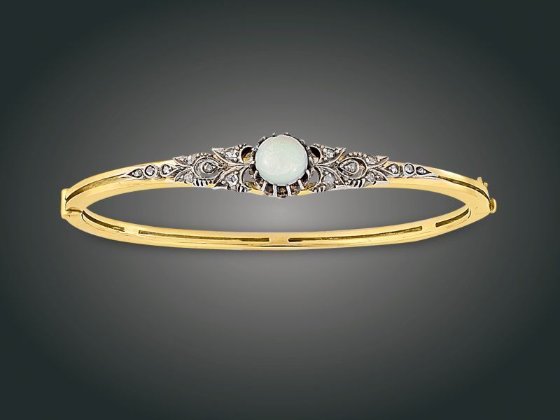 148. tétel, Karék, 14 k au, opál, 16 gyém. cca. 0,20 ct, 15,5 g