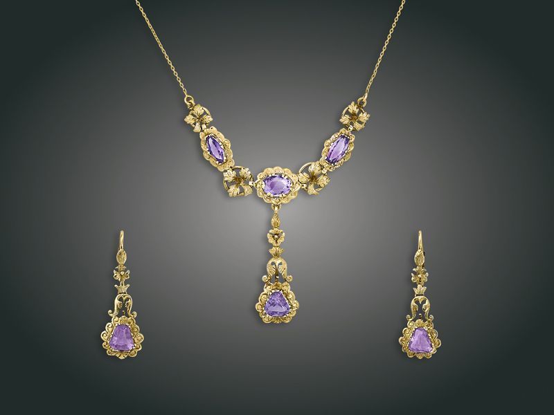 15. tétel, Garnitúra, 2 db, 14 k au, ametiszt, 9,5 g