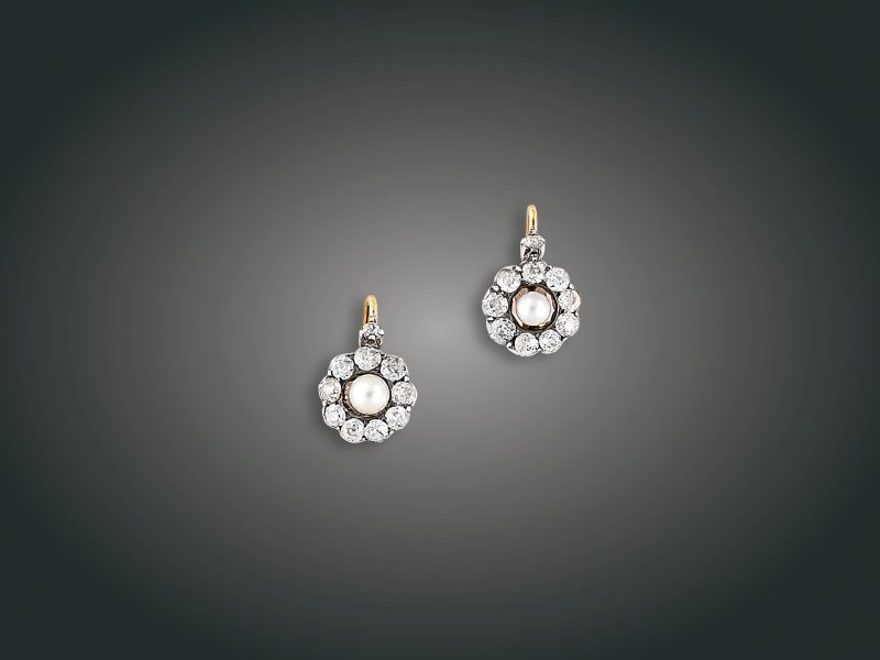 152. tétel, Fülbevaló, 14 k au, 20 bril. cca. 1,60 ct, t. gyöngy, 3,8 g