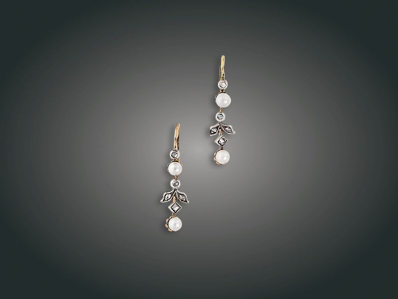 154. tétel, Fülbevaló, 14 k au, 10 gyém. cca. 0,20 ct, 4 t. gyöngy, 3,7 g