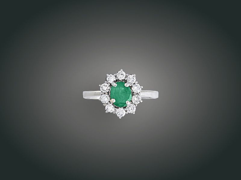 160. tétel: Gyűrű, 14 K au, 1 smaragd cca. 0,50 ct, 10 bril. cca. 0,50 ct, 3,3 g