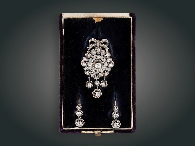 161. tétel, Garnitúra, 2 db, ag, au, 15 bril. cca. 3,30 ct, 39 gyém. cca. 0,80 ct, 21,8 g