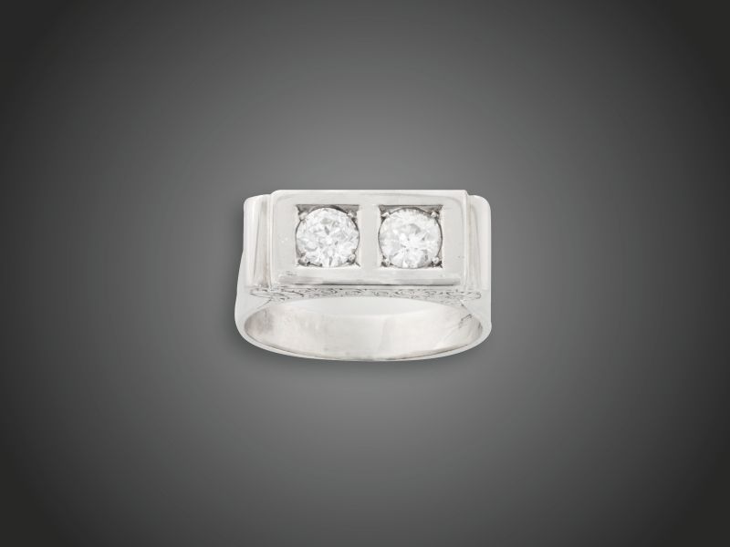 161. tétel, Sportgyűrű Fehérarany 585, szögletes forma fej, 2 care foglalt régi csiszolású briliáns cca. 0,70 ct (R2CrSi) ékítéssel, 1940 körül, utólagos fémjellel, 4,8 g, átmérő: 17,7 mm