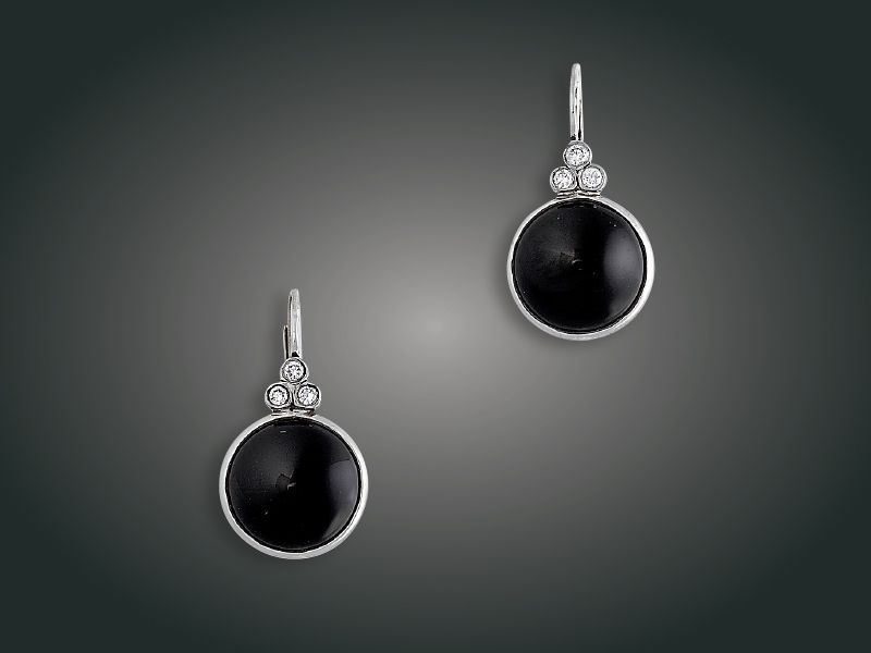 164. tétel: Fülbevaló, 14 K au, 2 ónix, 6 bril. cca. 0,20 ct, 6,4 g