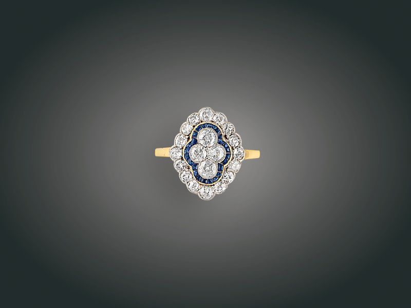 164. tétel, Gyűrű, 14 k au, 20 bril. cca. 1,20 ct, zafír, 3,6 g