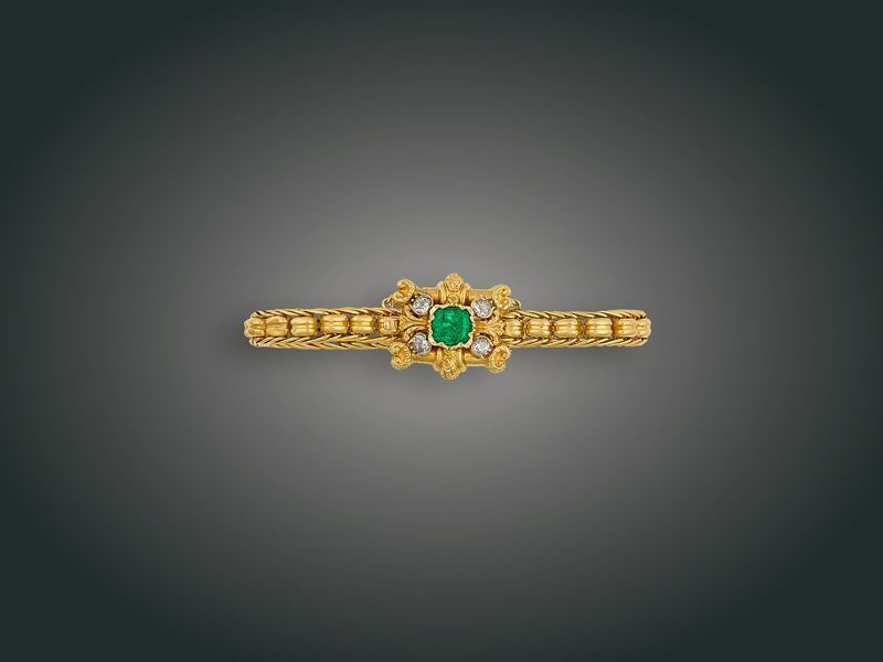 168. tétel, Karkötő, 14 k au, 4 bril. cca. 0,75 ct, 1 smaragd, 30,9 g
