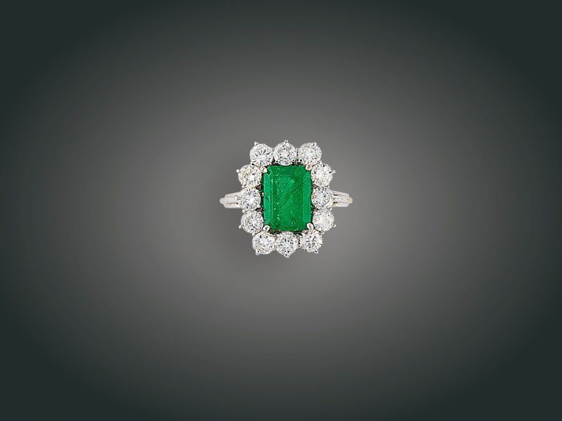 205. tétel, Gyűrű, 18 k au, 1 smaragd cca. 2,0 ct, 12 bril. cca. 1,20 ct, 4,3 g